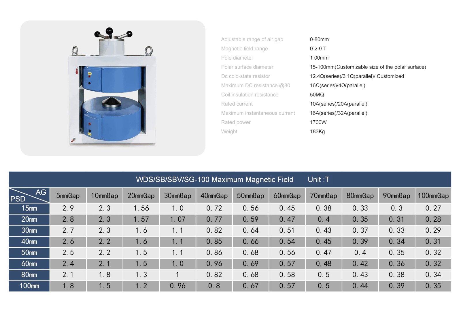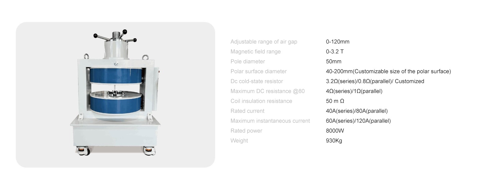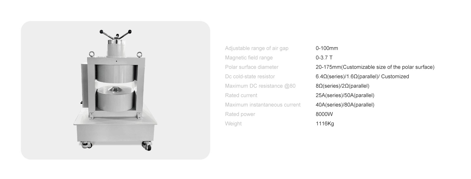The SBV electromagnet is a double-yoke(H-Frame) , variable air gap magnetic field generation equipment with one pole being adjustable. From the excitation of the excitating power source, the field vector forms a closed loop, and a high uniform magnetic field can be generated between two poles, and the field direction is along the axial direction of pole caps. All SBV electromagnets are equipped with a pair of standard replaceable pole caps made of purity iron, which can be replaced to suit to individual experiment requirements. The pure-iron structure is suitable for coils heat dissipation, and the option of cooling water system is also available for extend the operating time.
