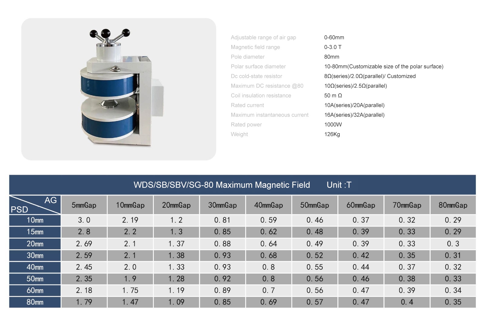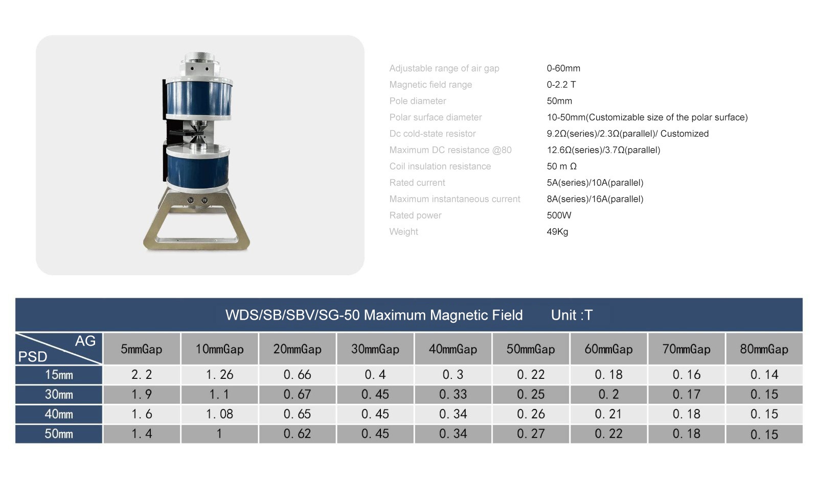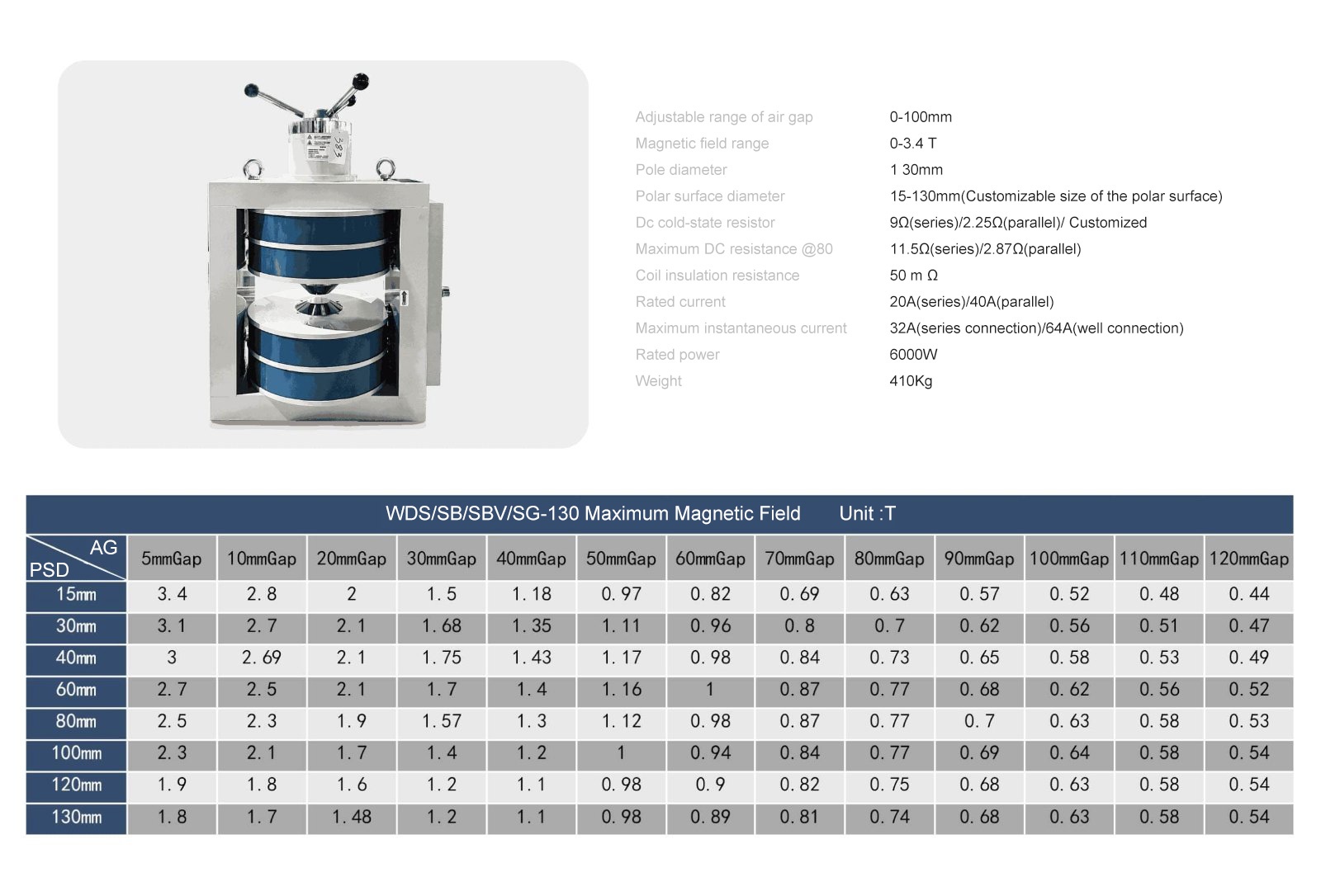 The SBV electromagnet is a double-yoke(H-Frame) , variable air gap magnetic field generation equipment with one pole being adjustable. From the excitation of the excitating power source, the field vector forms a closed loop, and a high uniform magnetic field can be generated between two poles, and the field direction is along the axial direction of pole caps. All SBV electromagnets are equipped with a pair of standard replaceable pole caps made of purity iron, which can be replaced to suit to individual experiment requirements. The pure-iron structure is suitable for coils heat dissipation, and the option of cooling water system is also available for extend the operating time.